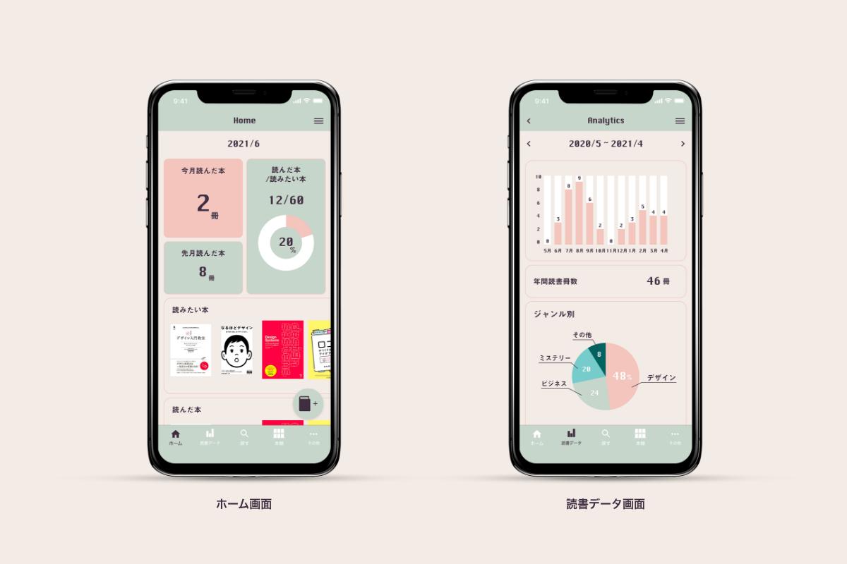 • 先月読んだ本と今月読んだ本を表示、積読本と読んだ本の割合を表示することで、読書の進捗状況を可視化し達成感を感じさせるようにした。